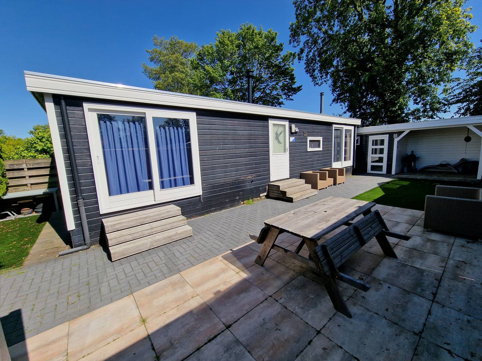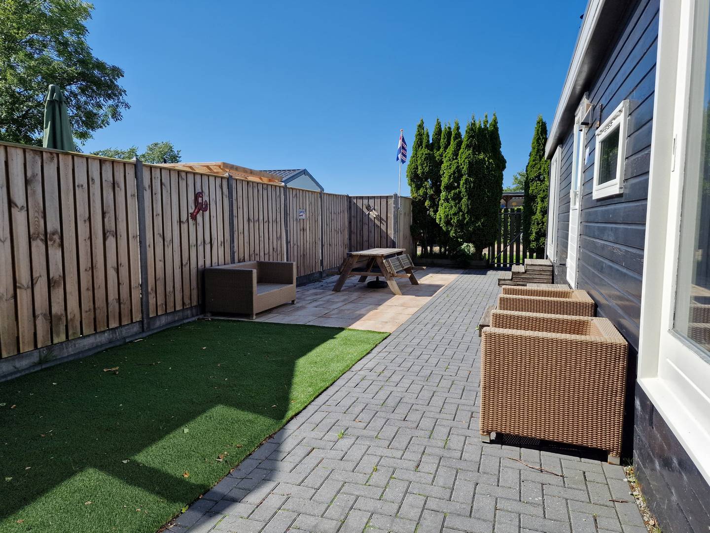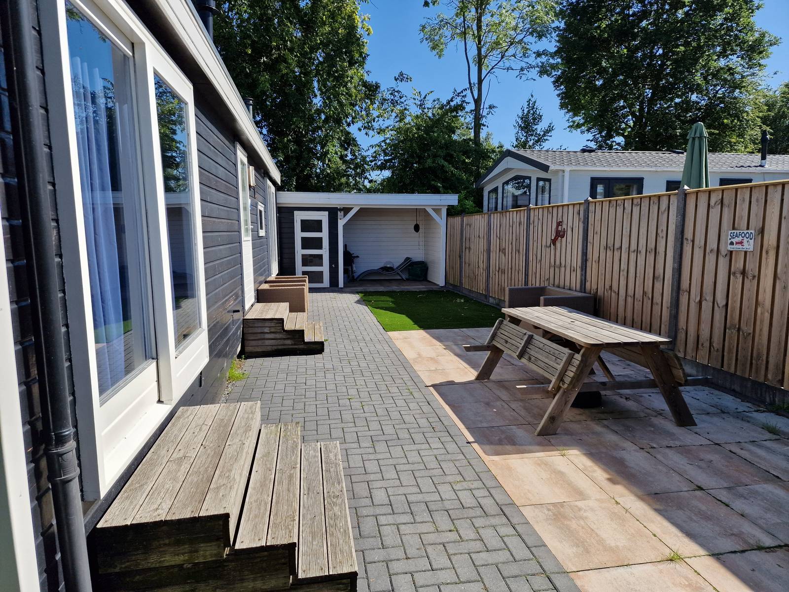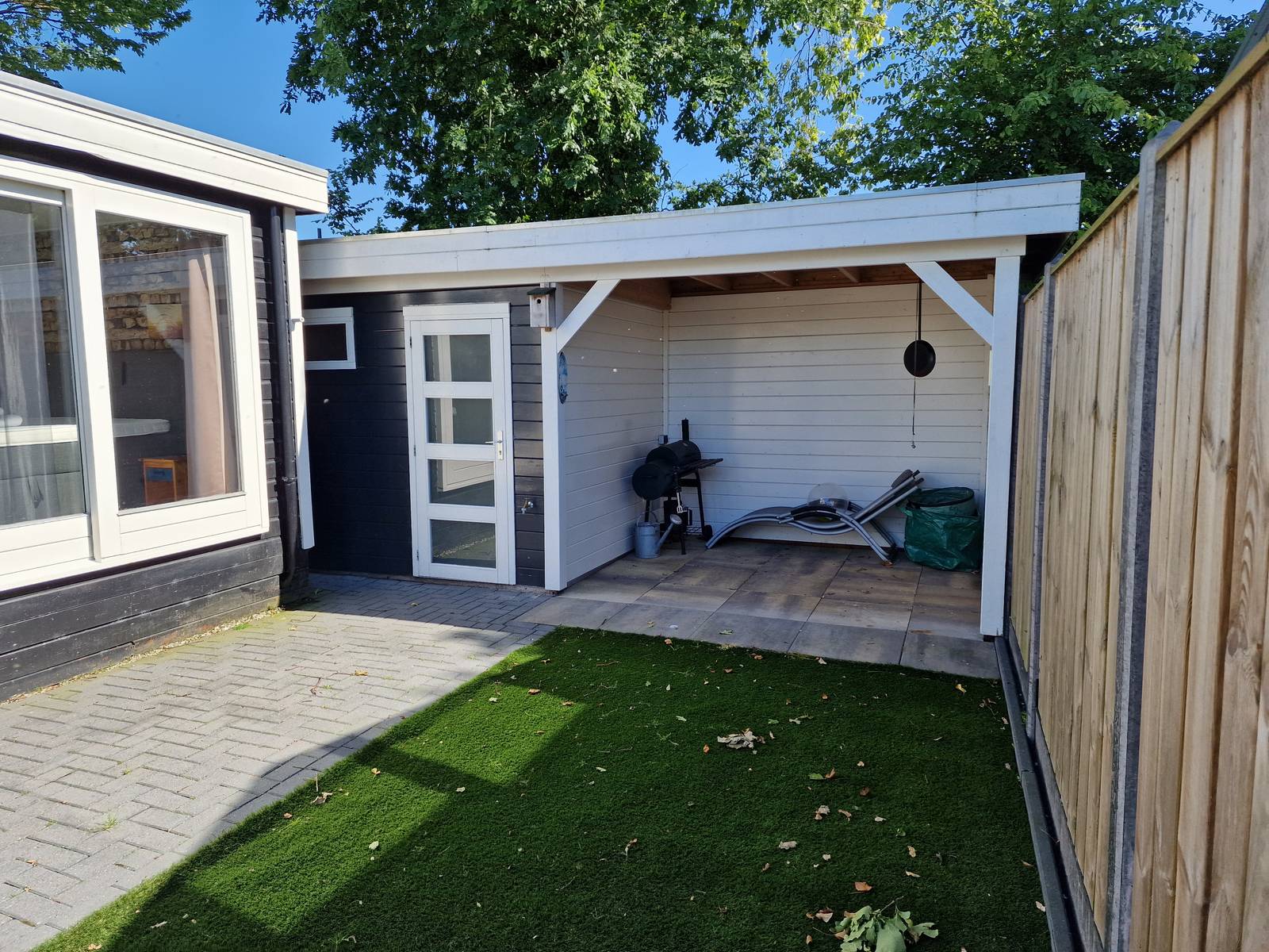 De ruime onderhoudsvrije tuin beschikt over een nieuwe schuur met overkapping.