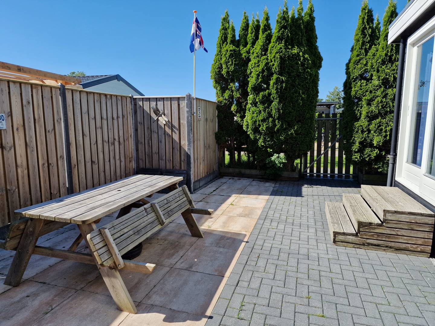 De buitenzijde van het chalet aan de zonkant behoeft enig verfwerk.