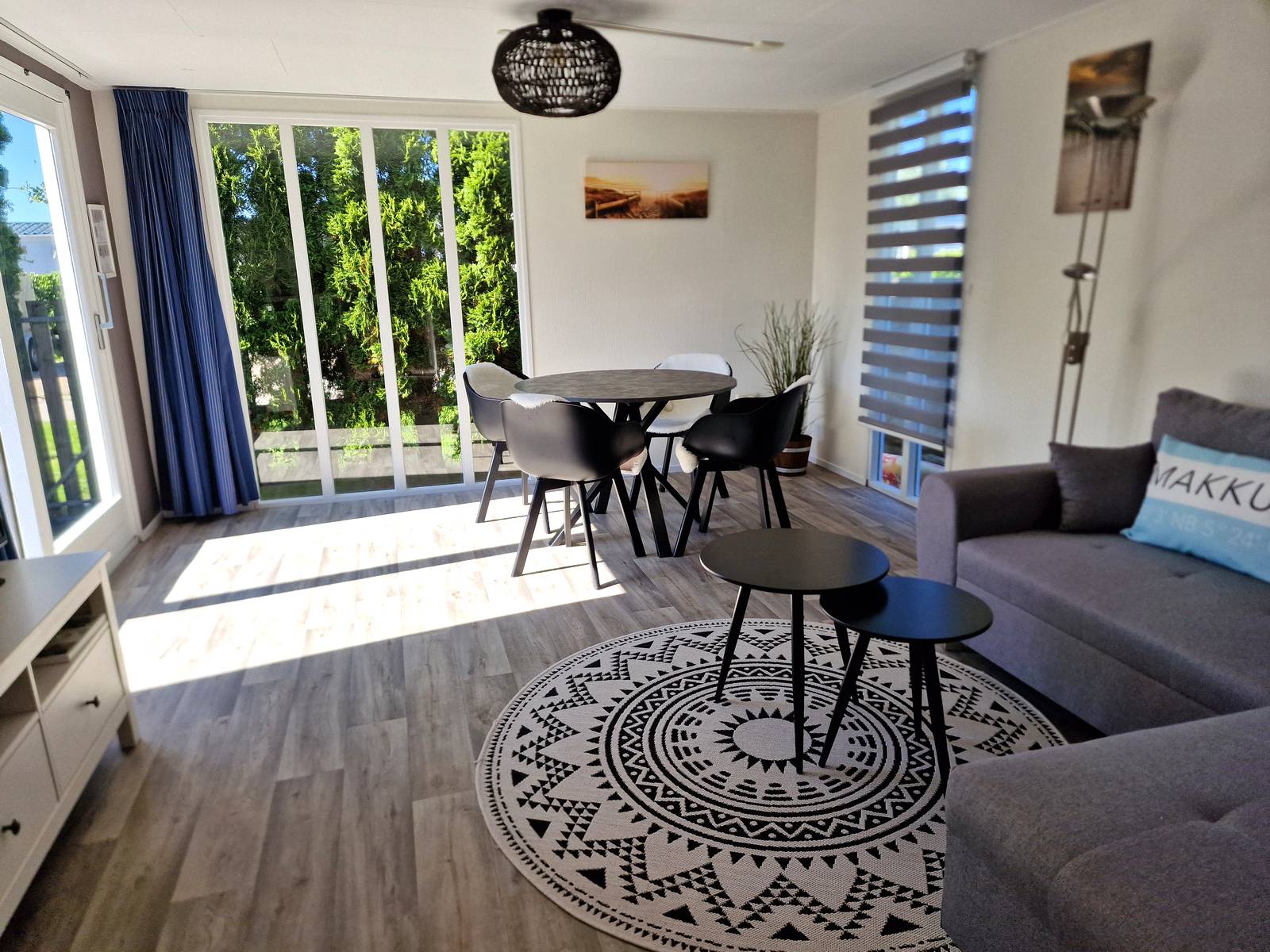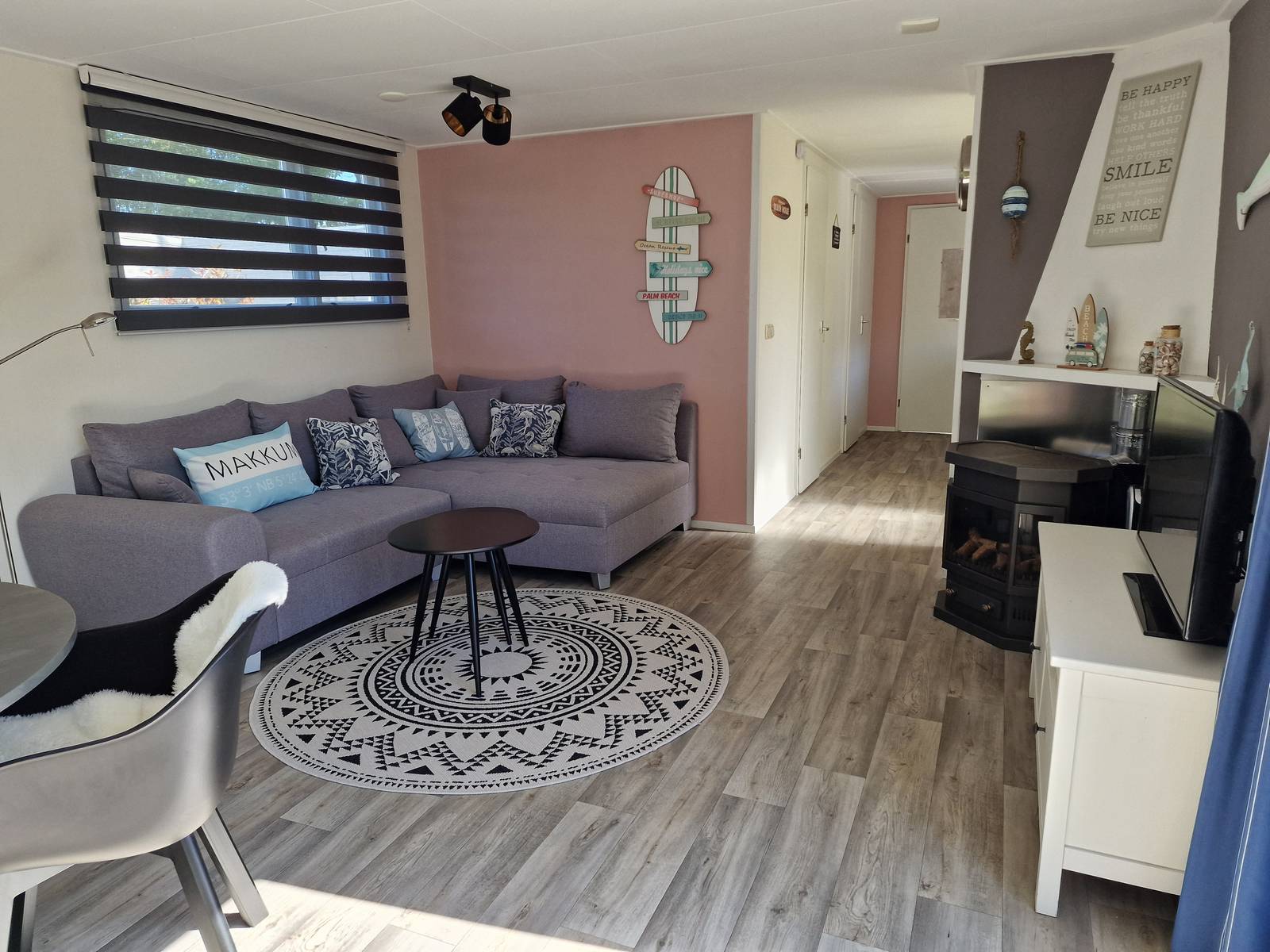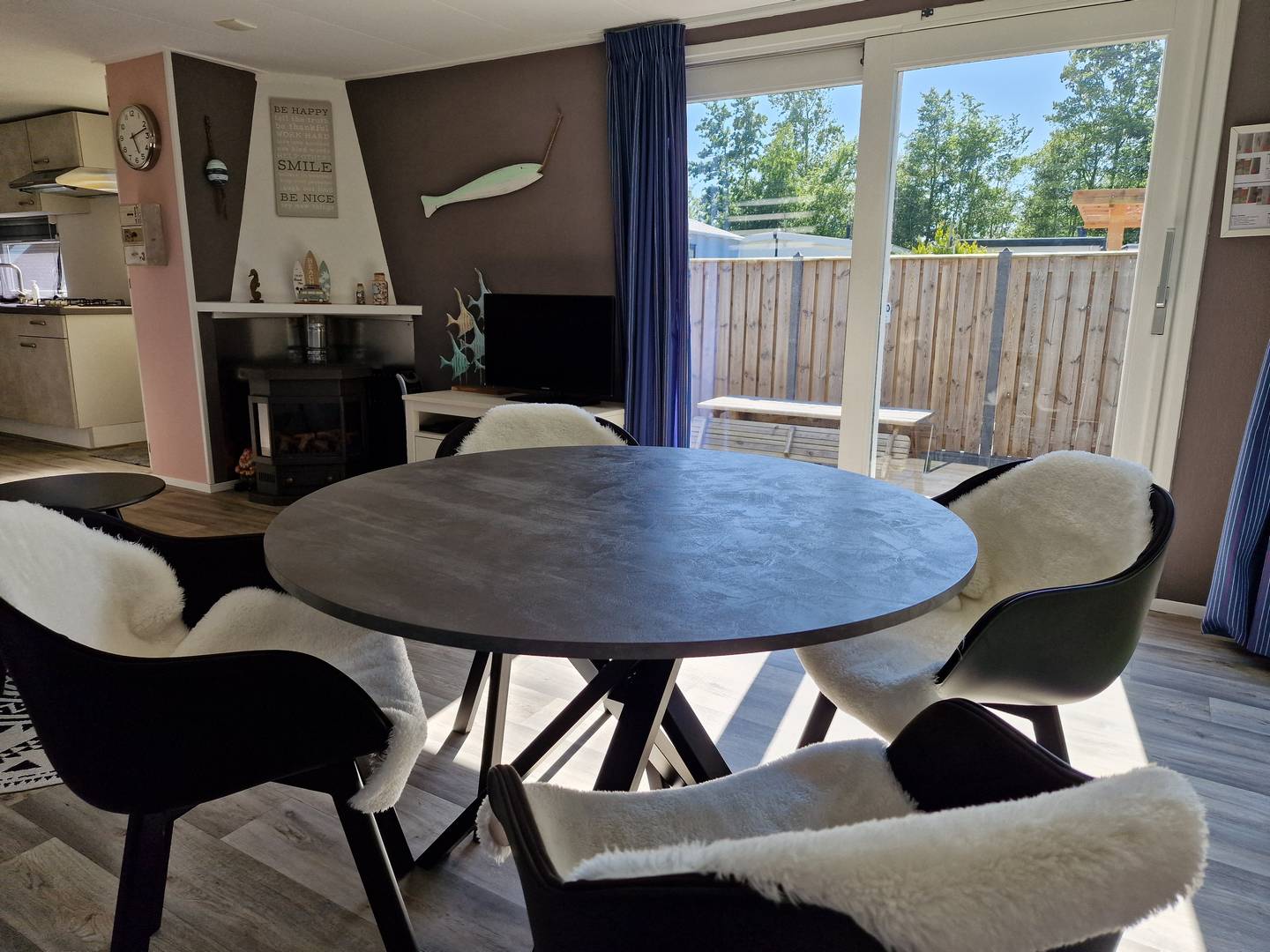 Ruime modern ingerichte woonkamer met gaskachel en schuifpui naar de tuin.