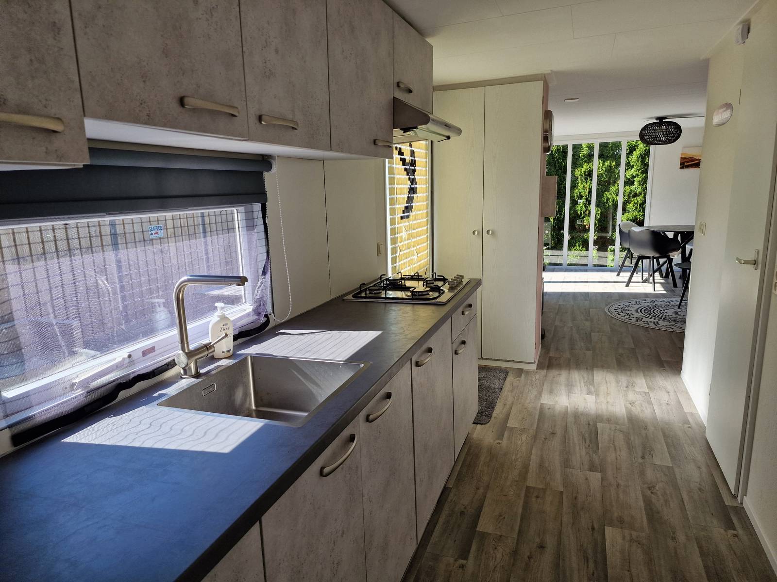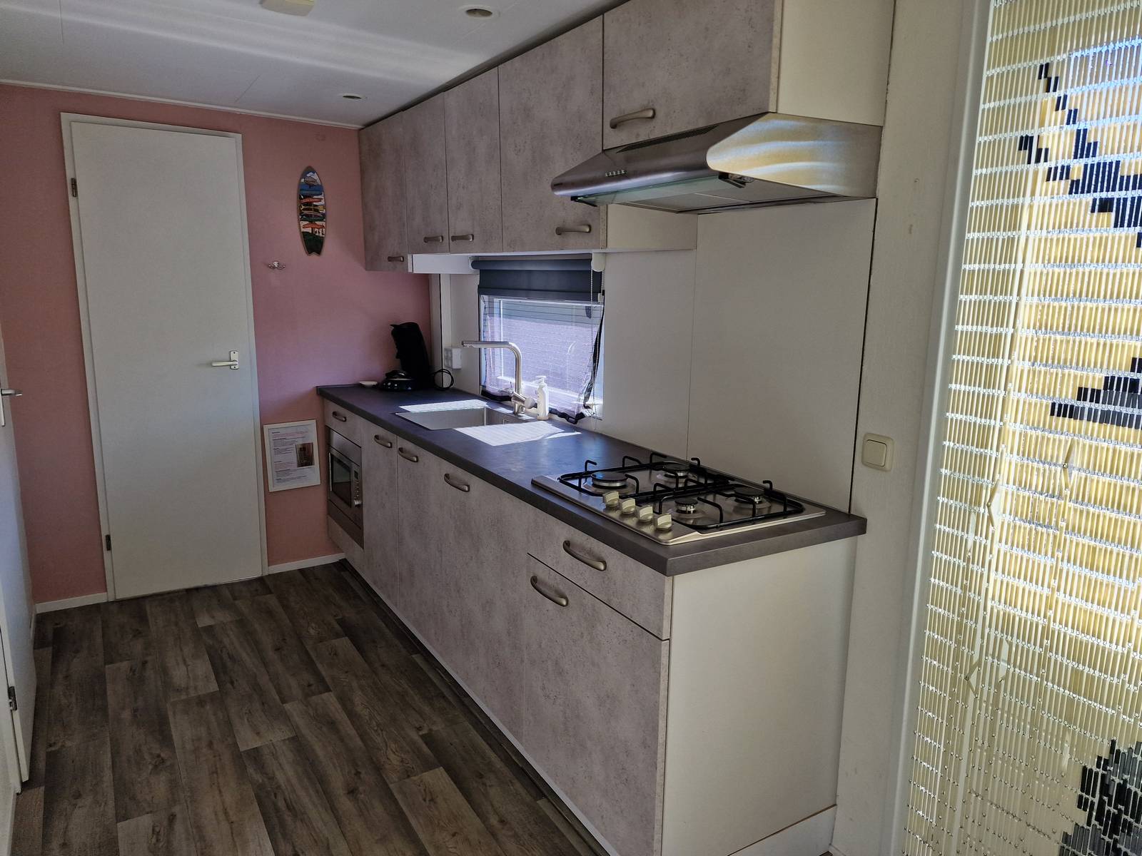 Vernieuwde keuken met 4-pits kookplaat, koelkast, inbouw combimagnetron en nieuwe geiser.