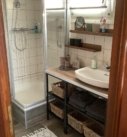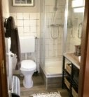 Badkamer met douchecabine, wastafel en toilet.