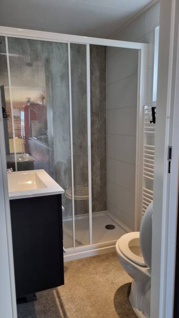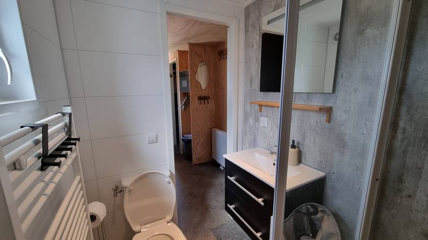 Badkamer: Douchecabine, wastafel en toilet.