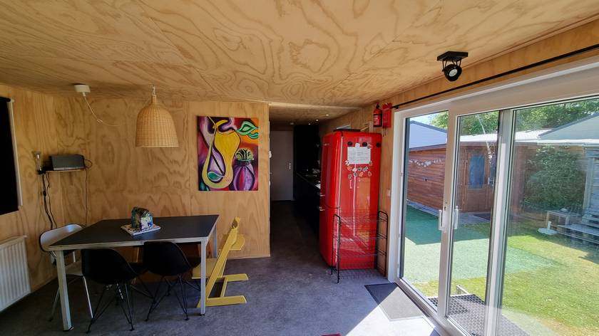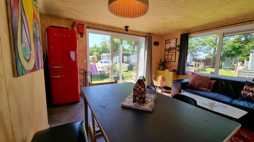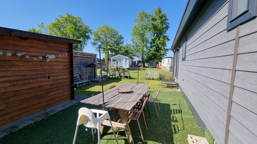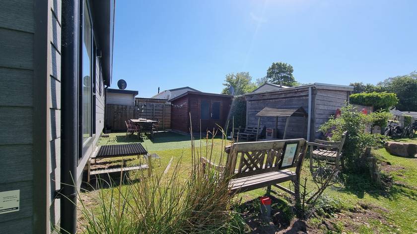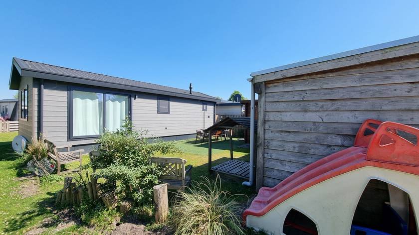 Dit stijlvolle nieuwe chalet (2023) staat op een rustig veld met een ruime tuin op steenworp afstand van het Makkumer strand.