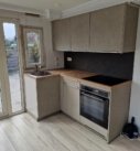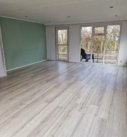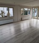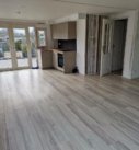 Ruime woonkamer met kleine open hoekkeuken.