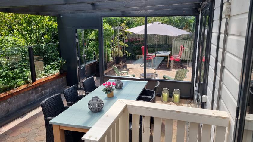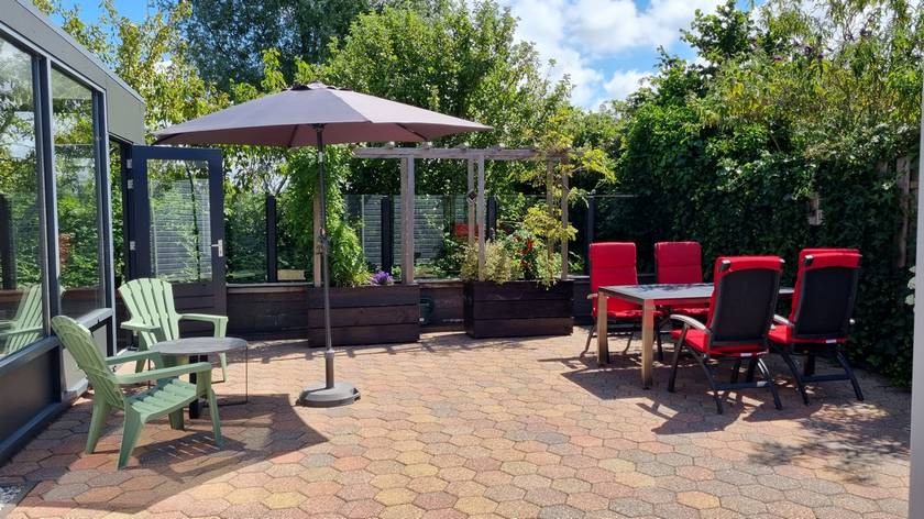 In de riante, onderhoudsvrije tuin, bevindt zich de grote serre, diverse tuinmeubelen en een bergschuur.