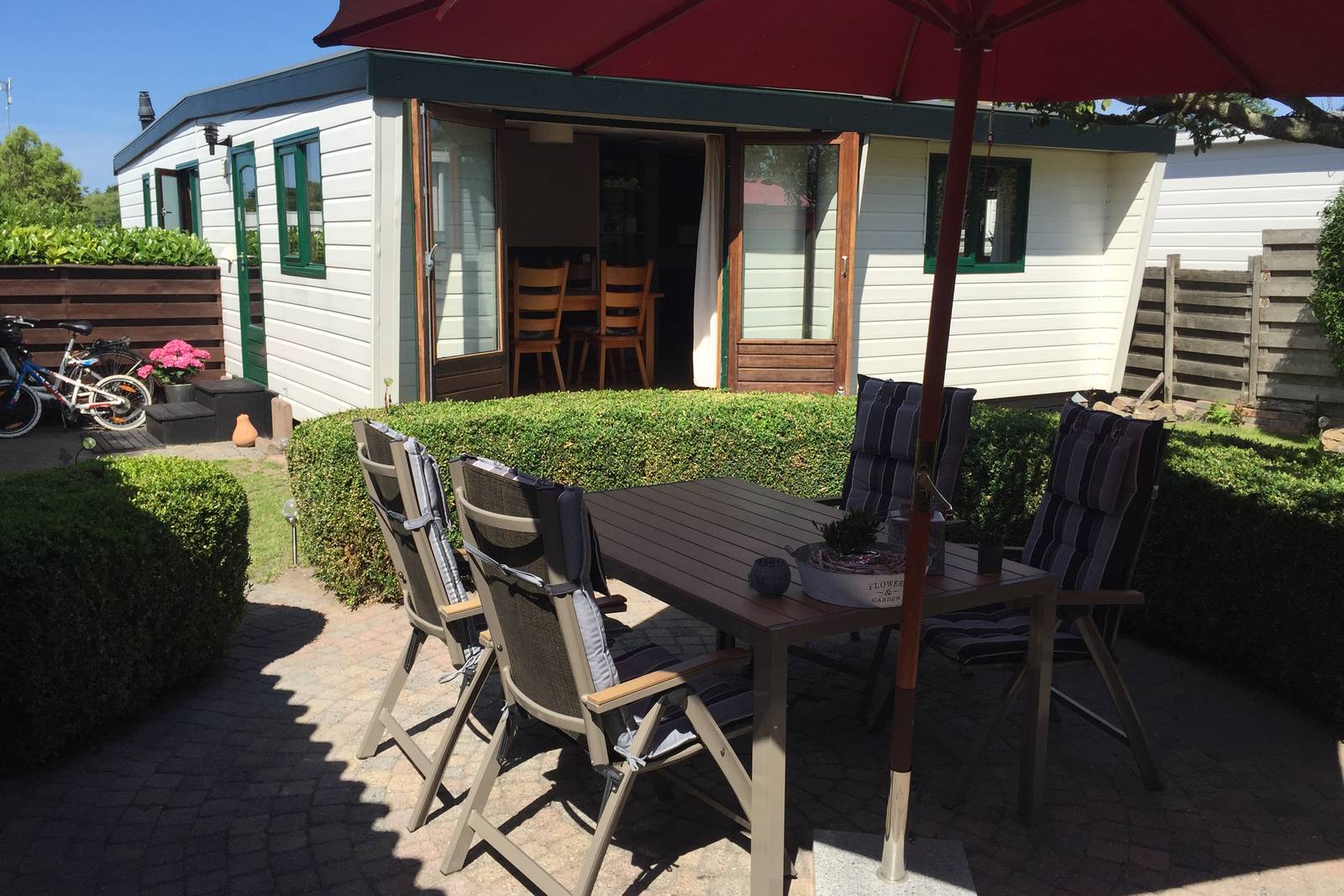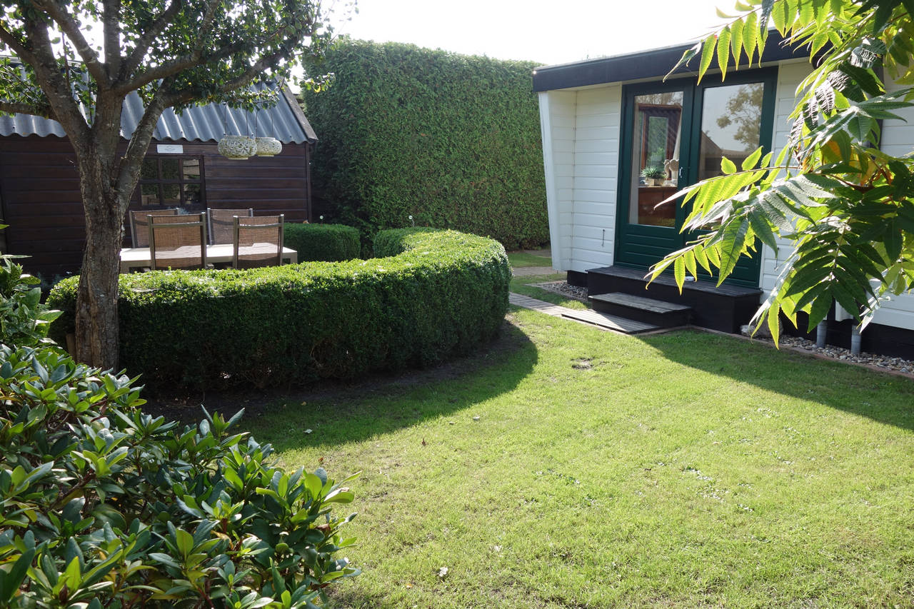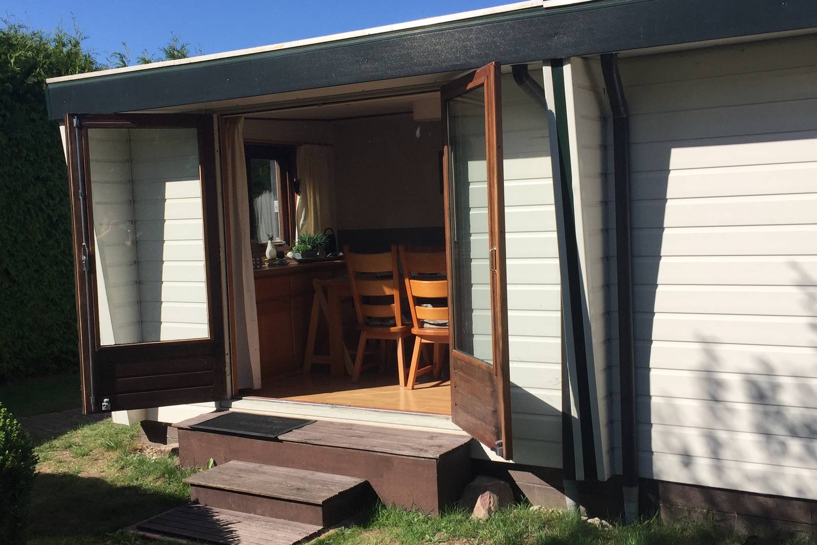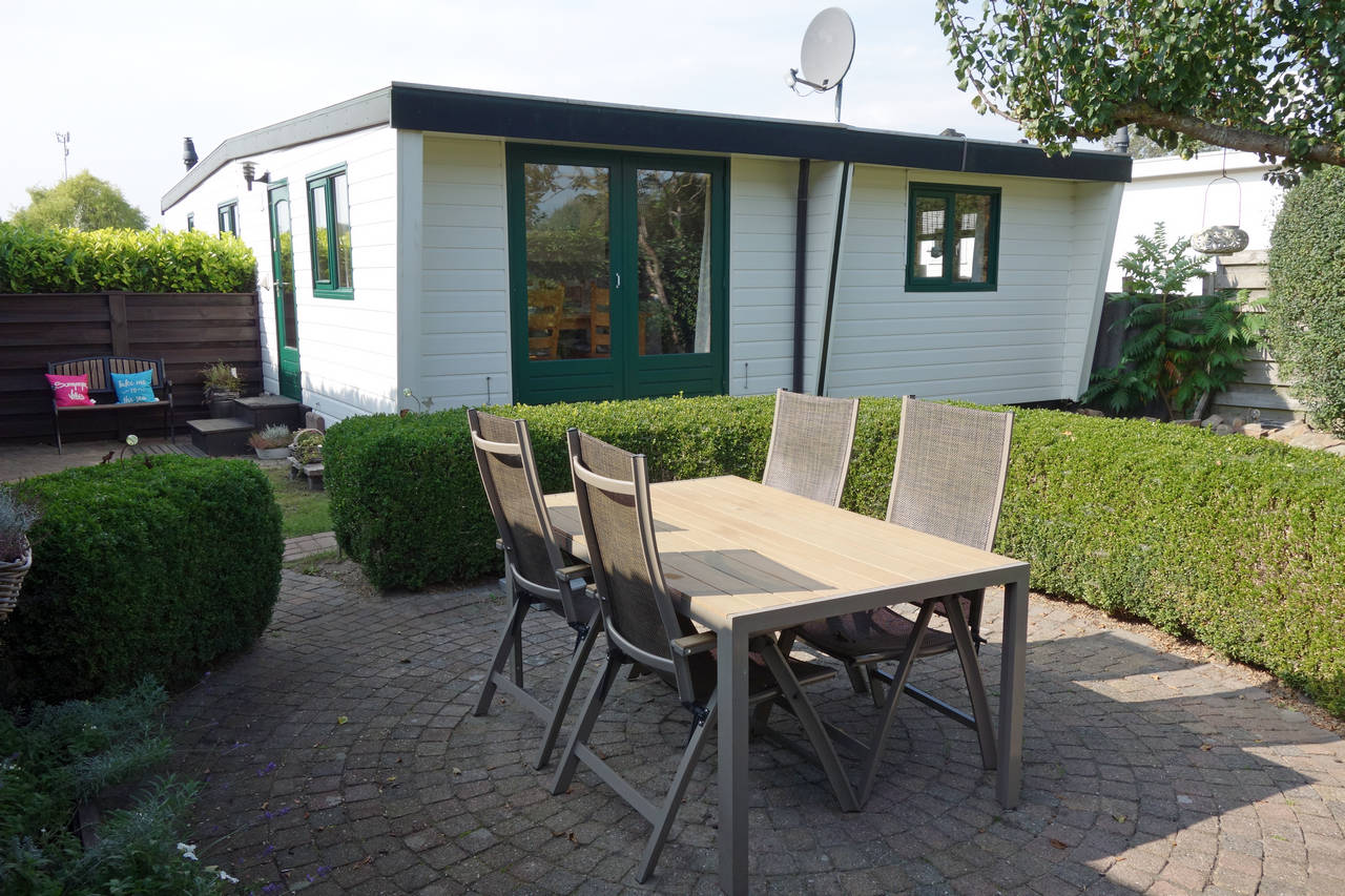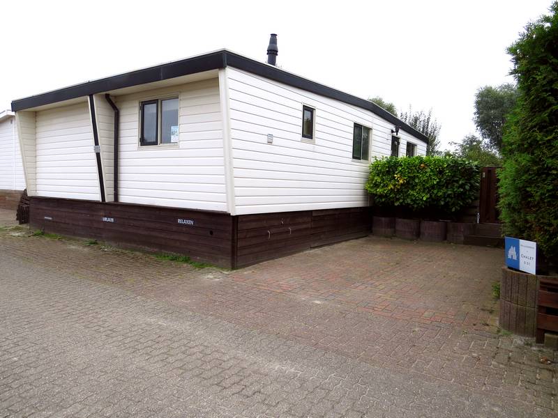 Buitenzijde van het chalet is van kunststof. De kozijnen zijn van harthout met thermopane ramen.