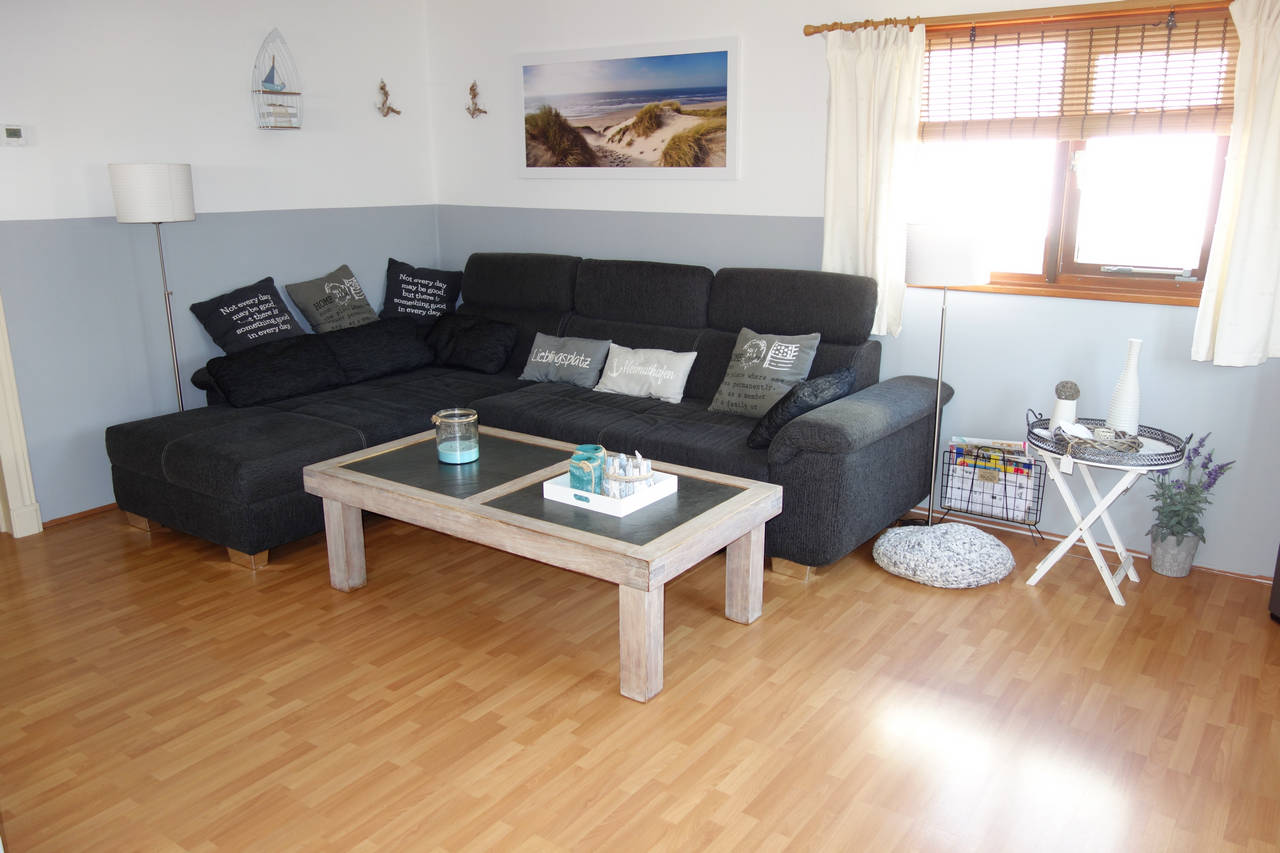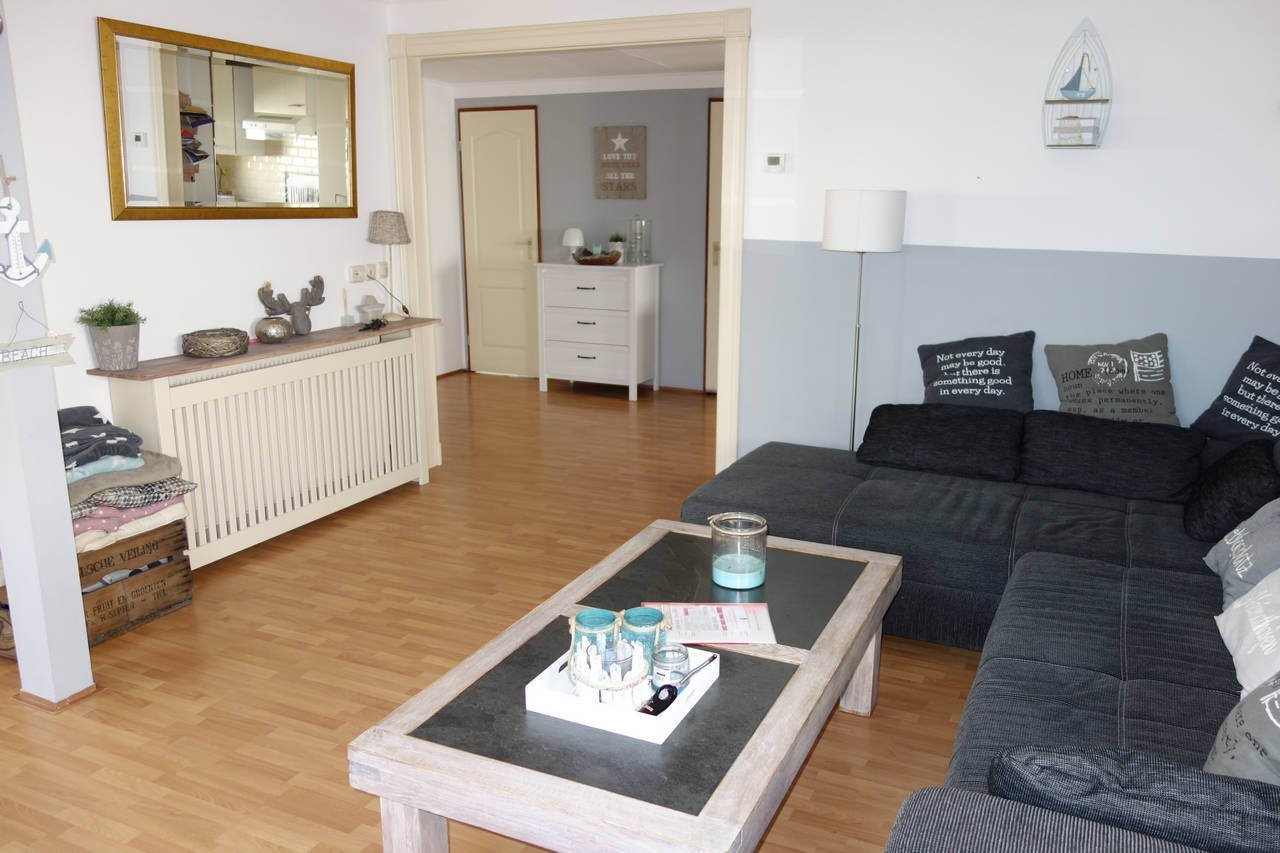 Zeer ruime woonkamer met pelletkachel en openslaande deuren naar de tuin.