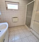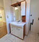 Badkamer met douchecabine, wastafelmeubel en wasmachine aansluiting.