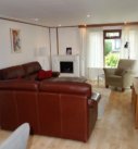Ruime woonkamer met zowel de toegangsdeur als openslaande deuren naar de tuin.