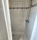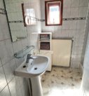 Badkamer, volledig betegeld, met douchecabine en wastafel.