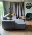 Gezellig ingerichte woonkamer met airconditioning, nieuw meubilair, LCD-TV en openslaande deuren naar de tuin.