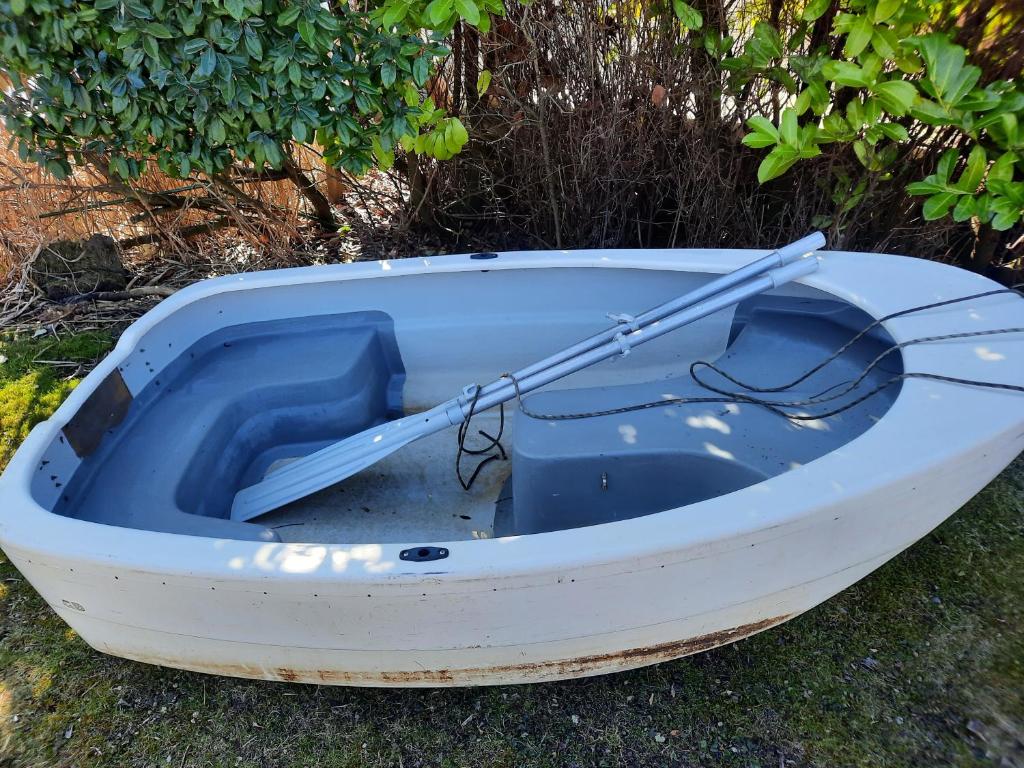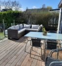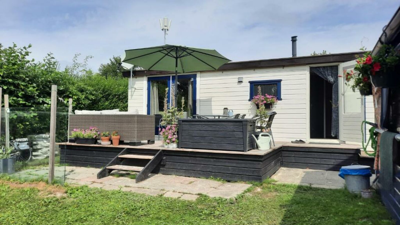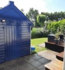 In de tuin een nieuw terras, een steiger aan het water en een ruime geïsoleerde bergschuur.