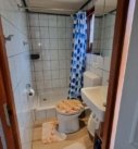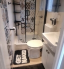 Badkamer met douche, wastafel en toilet.