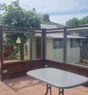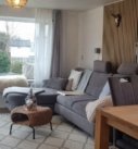 Woon-zit gedeelte met pelletkachel en openslaande deuren naar de tuin.