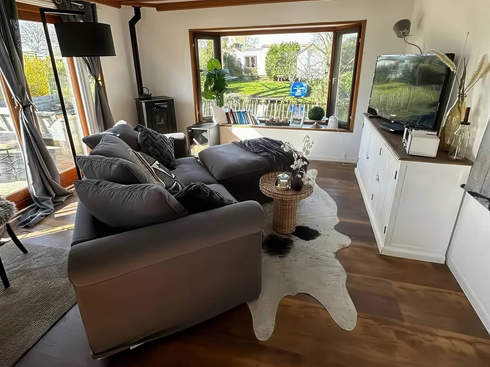 Woonmaker met nieuwe vloer en meubels zoals een slaapbank, pelletkachel en uitschuifbare eettafel.