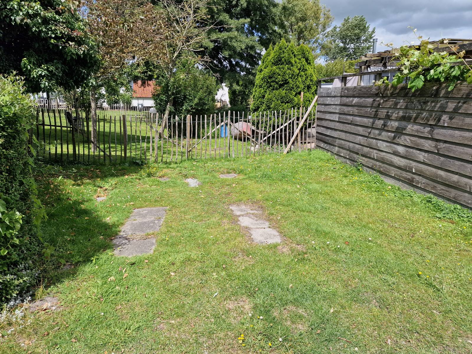 In de tuin een kunststof schuur.