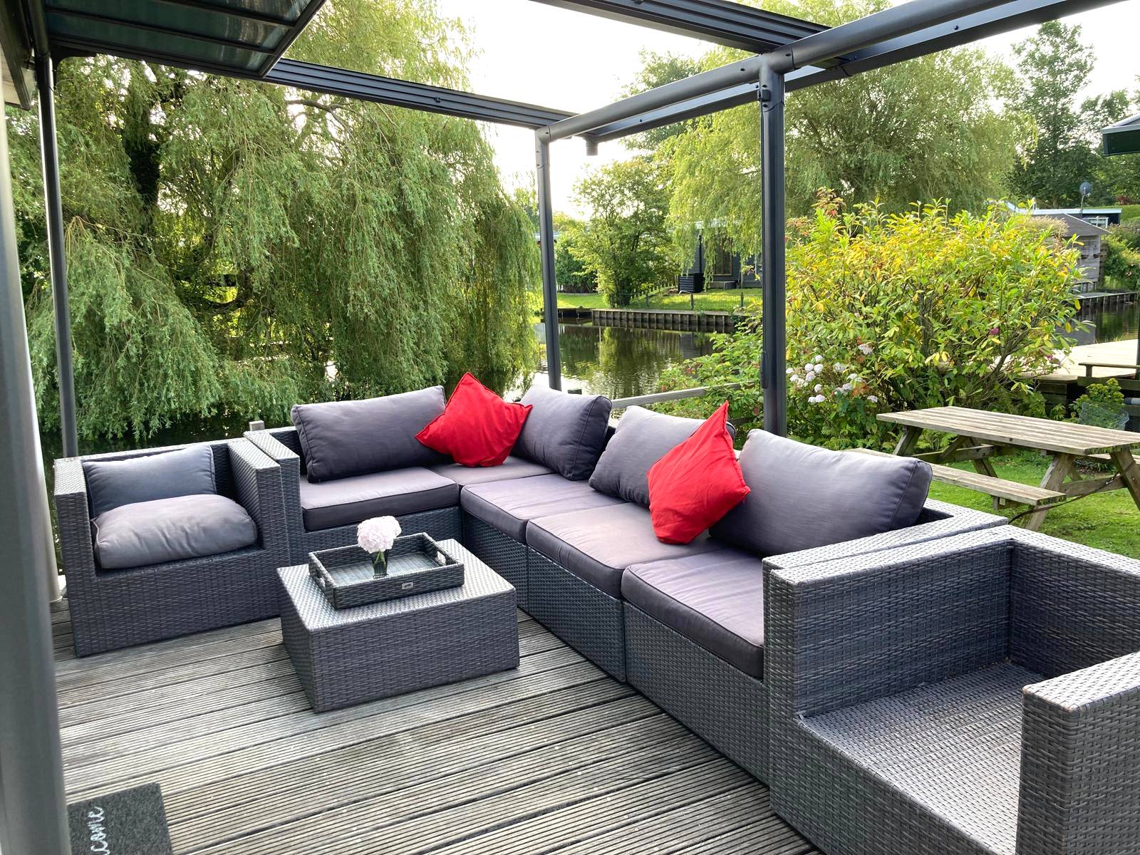 Am Wasser gibt es eine Terrasse zum Entspannen am Wasser. Angeln ist hier ohne Angelschein erlaubt.