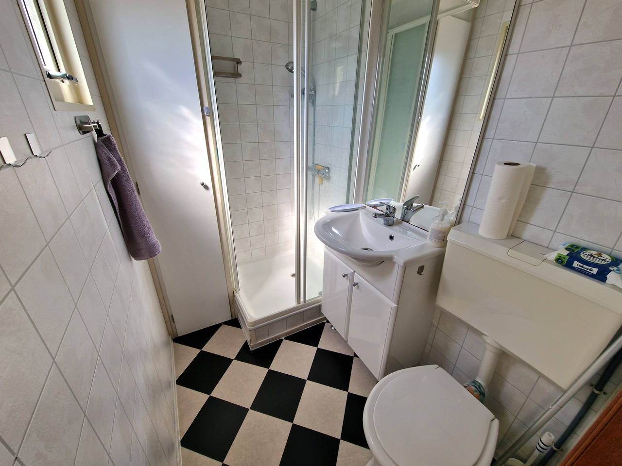 Badezimmer mit Duschkabine, Waschbecken und Toilette.