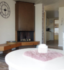 Mooi ingerichte woonkamer met open gashaard, LCD-TV en openslaande deuren naar de tuin.