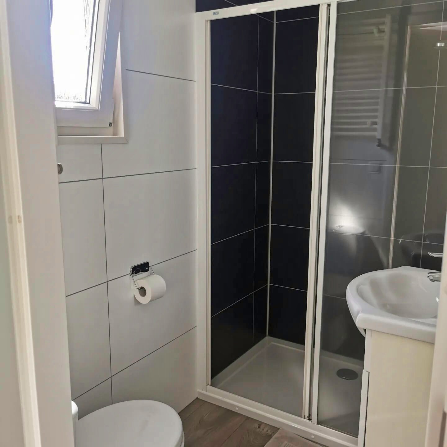 Badkamer met ruime douchecabine, wastafel en toilet.