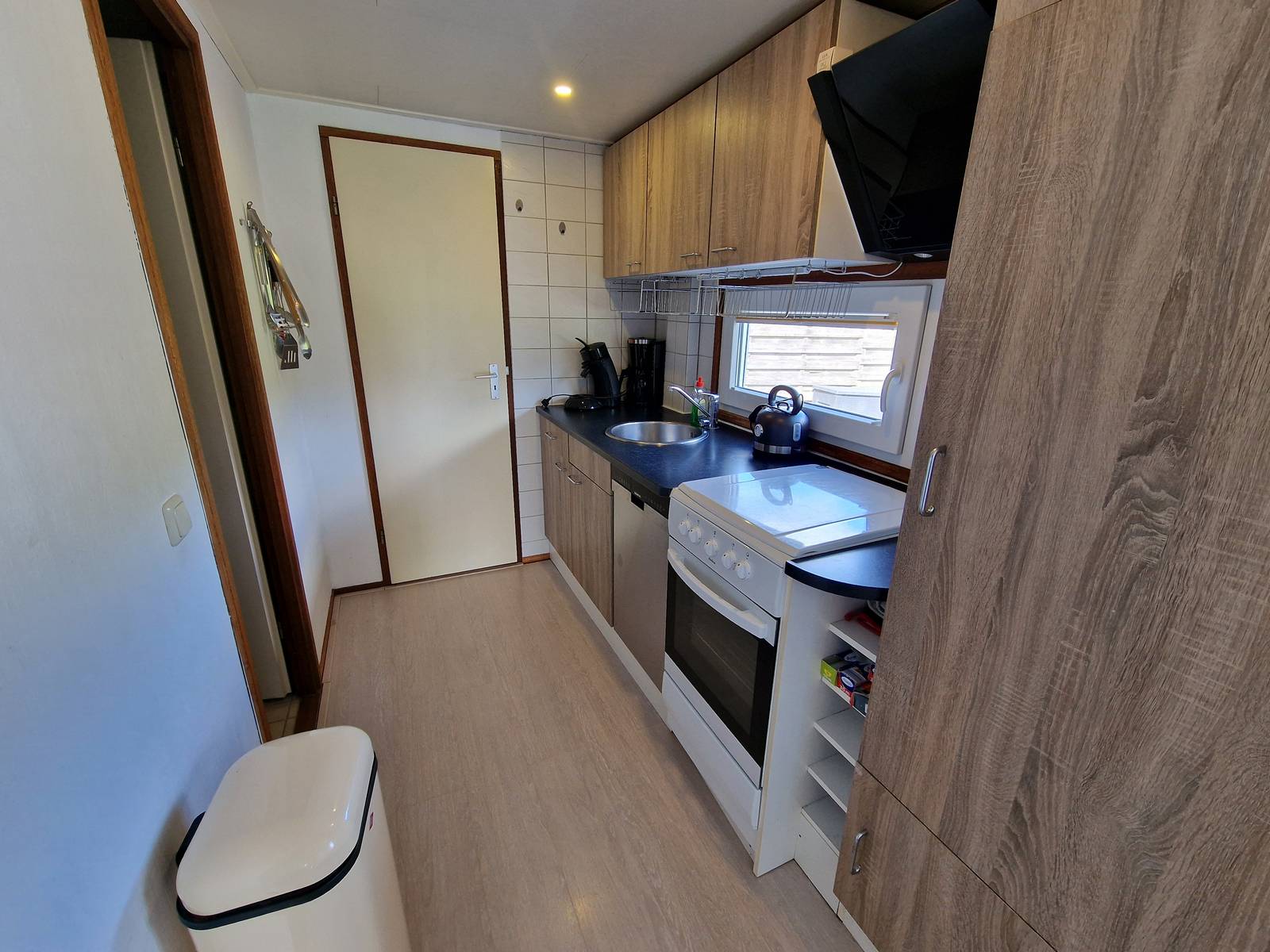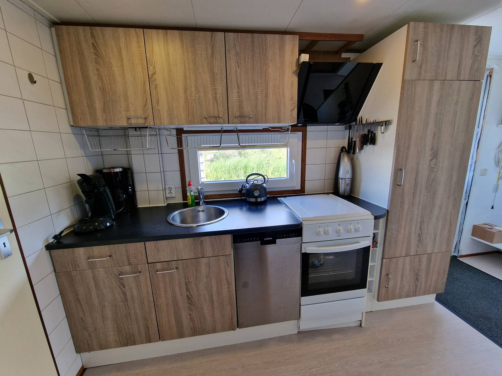 Keuken met vaatwasser, koelkast, oven en magnetron. Zowel een koffiefilter- als pad machine is aanwezig.