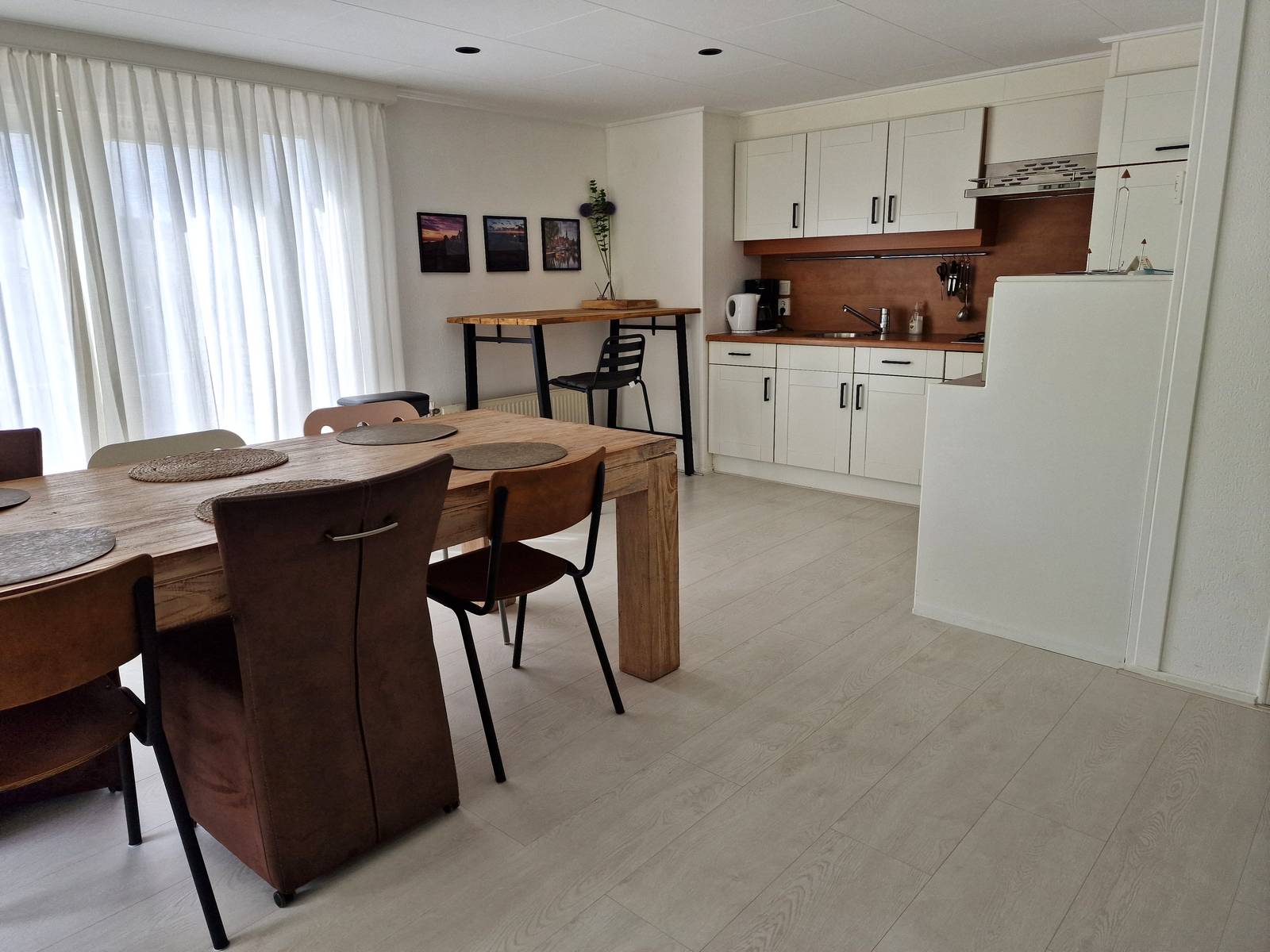 Ruime open keuken met koelkast, kookplaat en afzuigkap.