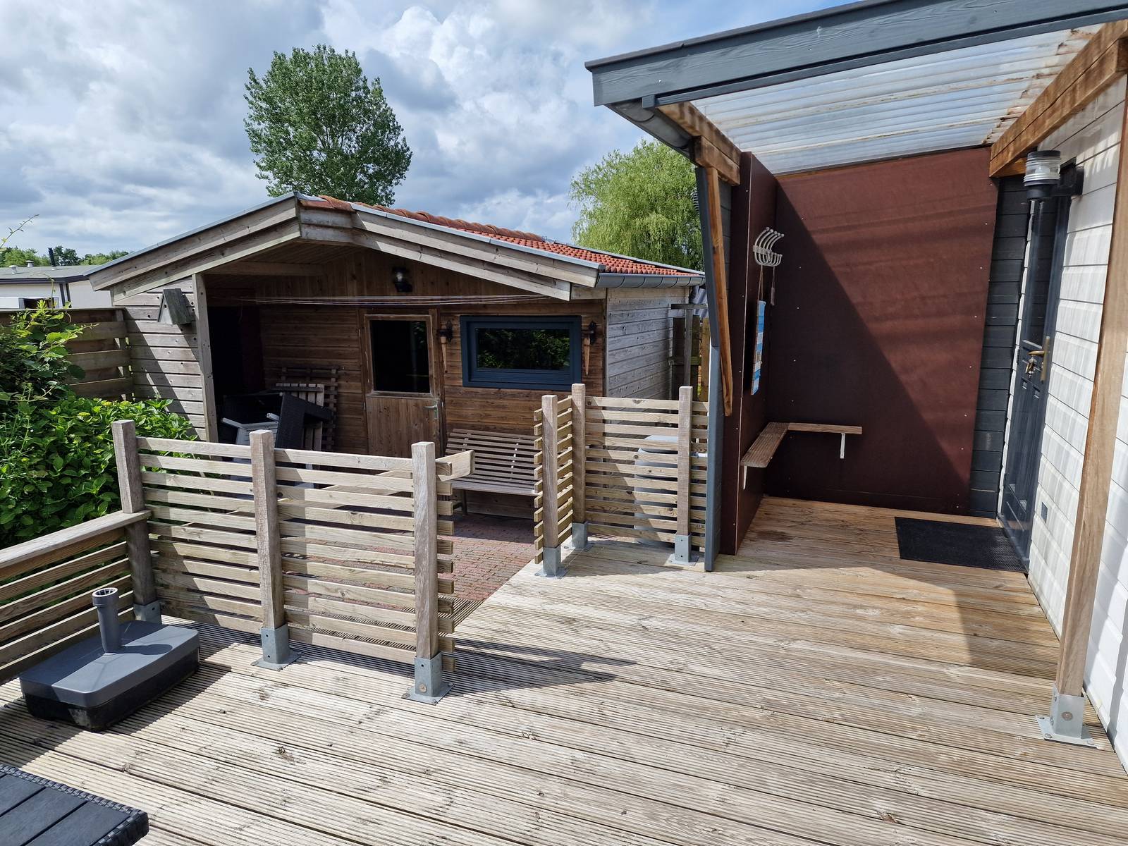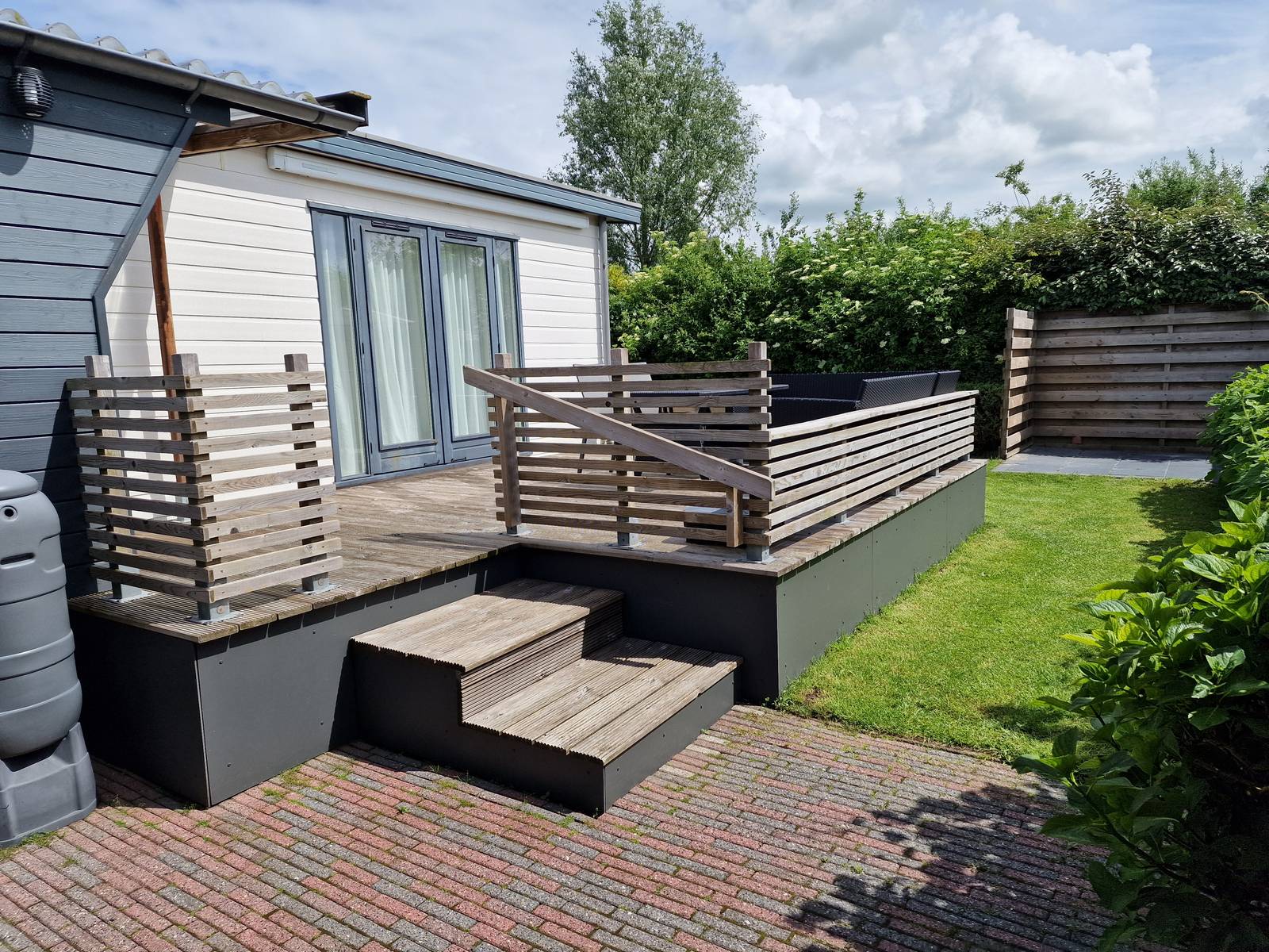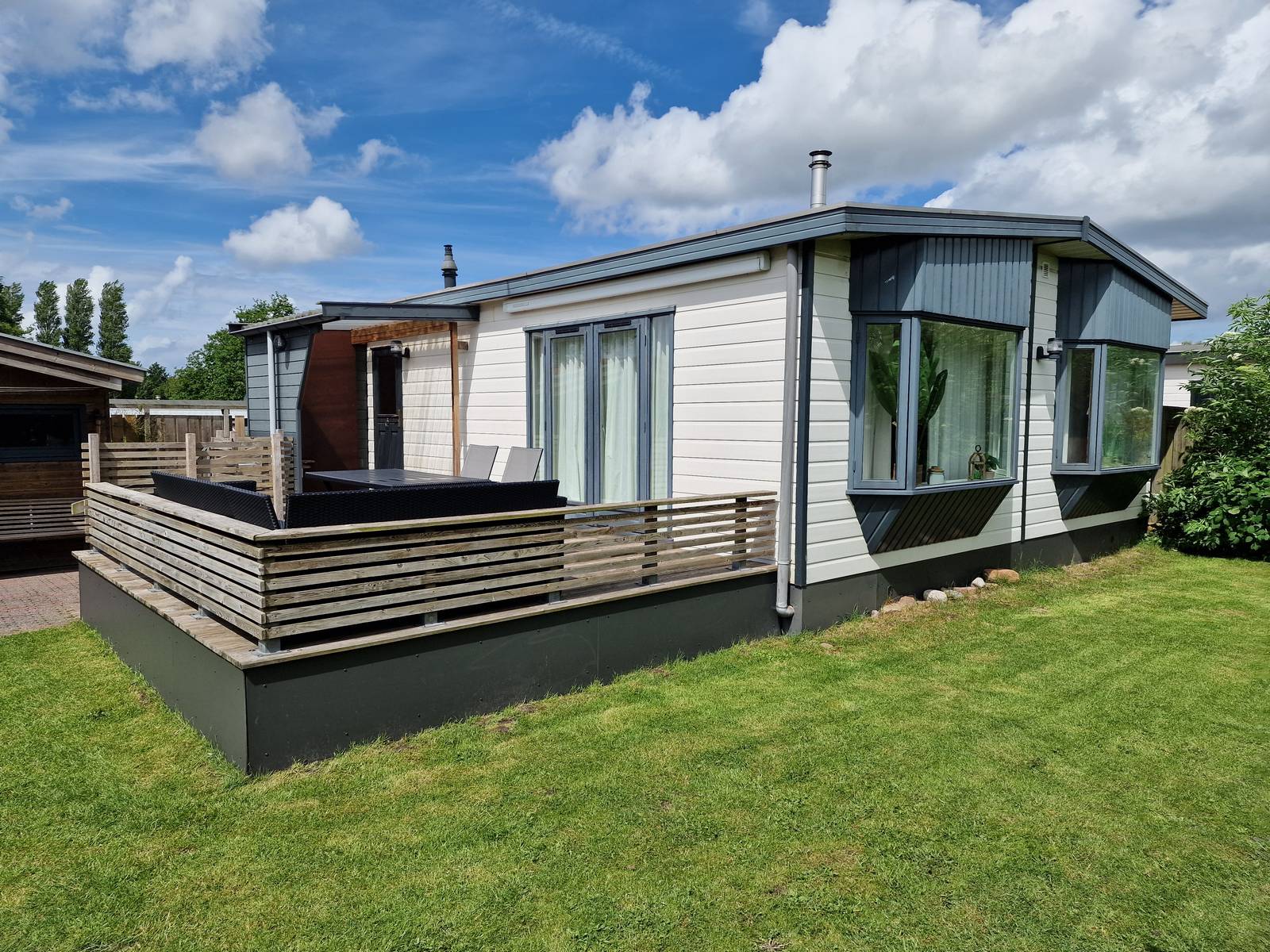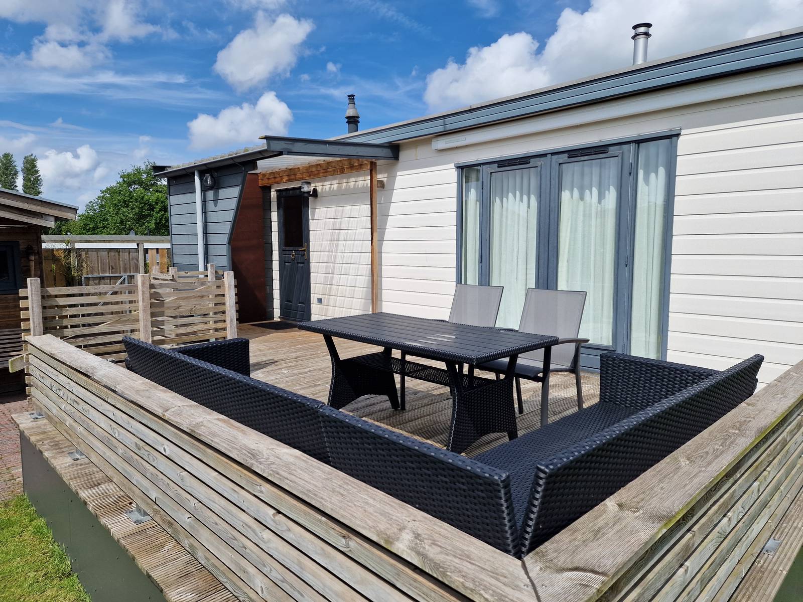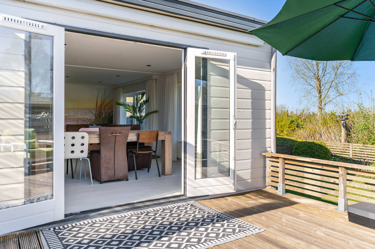 Zeer comfortabel en luxe ingericht dubbel chalet. Het chalet ligt aan de rand van het park en heeft een grote tuin met groot vlonderterras en grasveld en biedt veel privacy. Op de aanwezige ligstoelen kunt u hier optimaal ontspannen.
