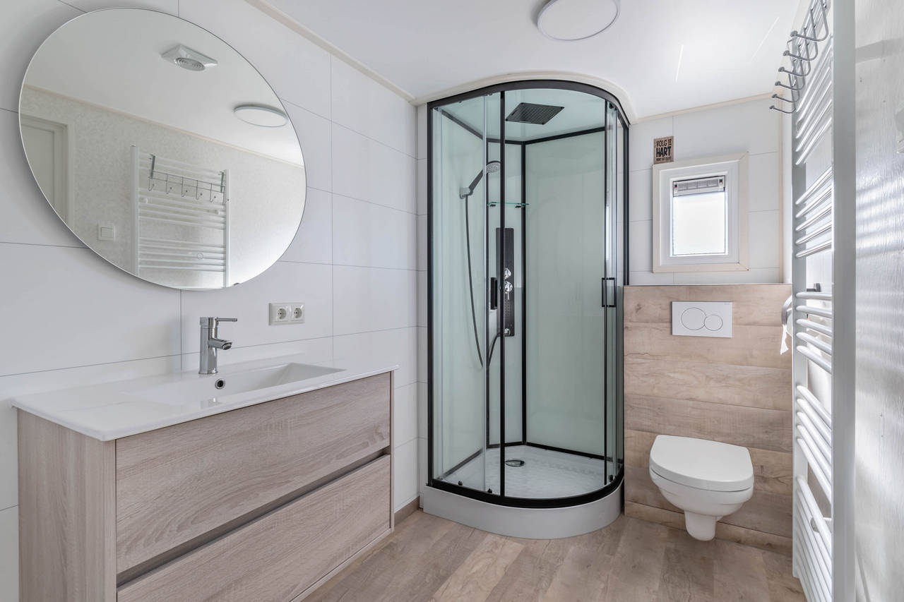 Prachtige nieuwe badkamer met douchecabine, wastafelmeubel en toilet.