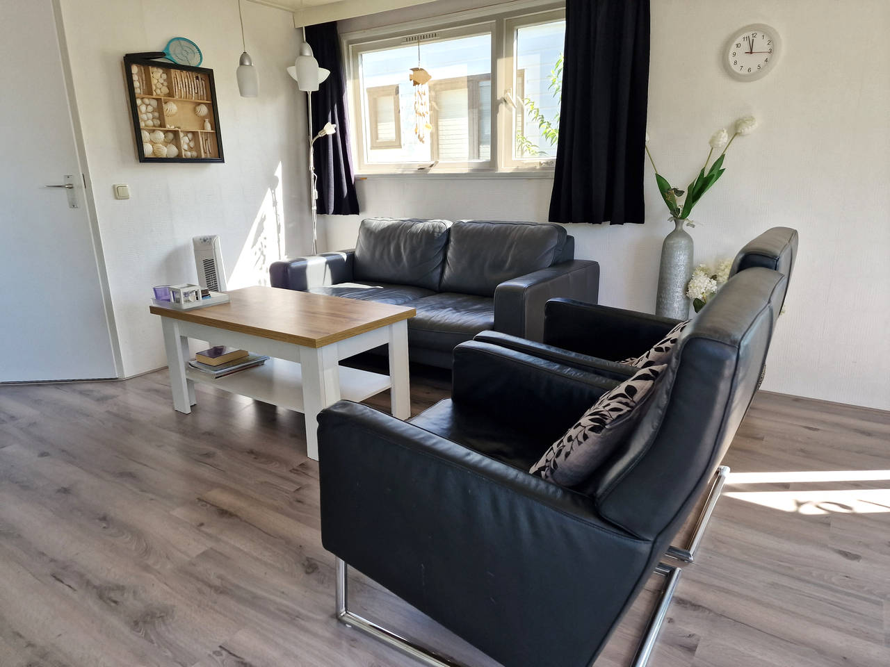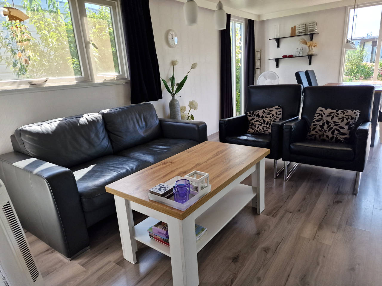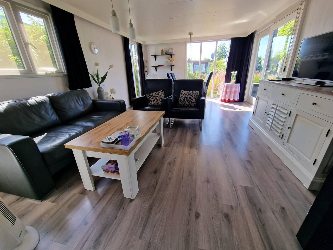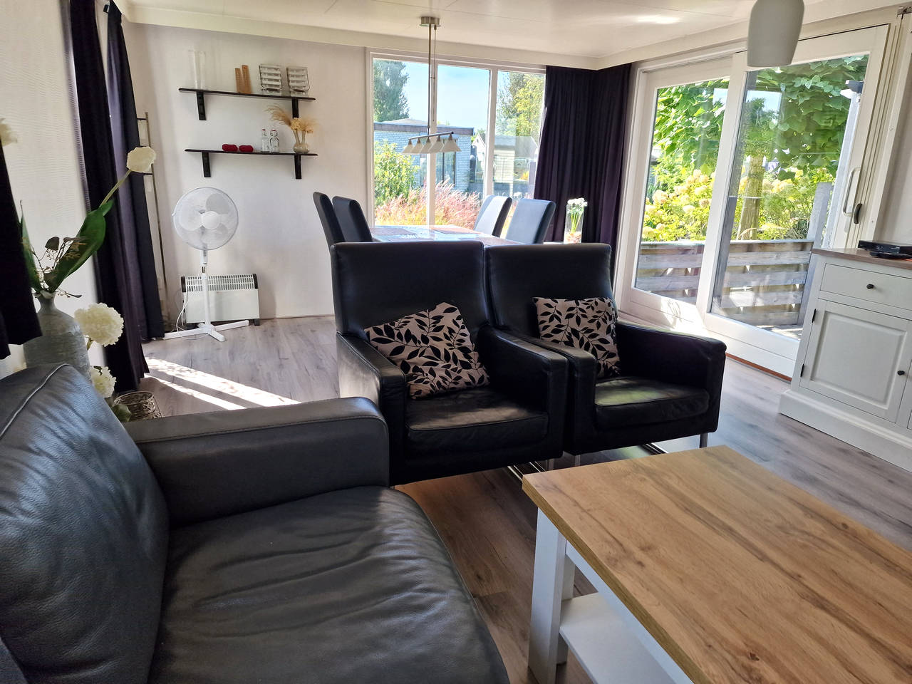 Ruime woonkamer met comfortabele meubels en schuifpui naar de tuin.